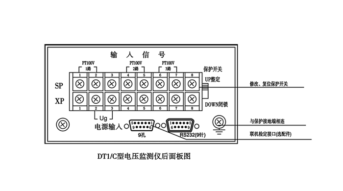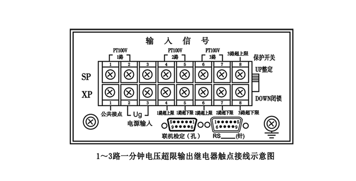 在接線板中上排SP的1,2腳接1路電壓信號(hào)輸入;SP的4,5腳接2路電壓信號(hào)輸入;SP的6,7腳接3路電壓信號(hào)輸入。下排XP中2,3腳接Ug交流工作電源,其中Ug=AC100V或220V或380V,以儀表后面板實(shí)際所標(biāo)工作電源電壓為準(zhǔn)。電源回路熔絲(0.25A)已裝入表內(nèi),接線板上無(wú)熔絲。