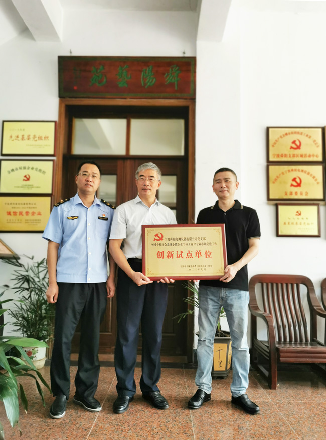 9月4日上午,頂著熾熱的太陽,由余姚市市場監(jiān)督管理局副局長、黨委委員姜春良帶隊,市陽明市場監(jiān)管所所長成波、市個協(xié)秘書長谷鋒一行陪同下,受寧波市市場監(jiān)督管理局之托,到我司頒授“全國個私協(xié)會系統(tǒng)‘小個專’黨建工作創(chuàng)新試點單位”銅牌。